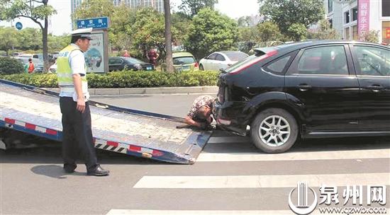 民警将违停在斑马线上的车辆拖走