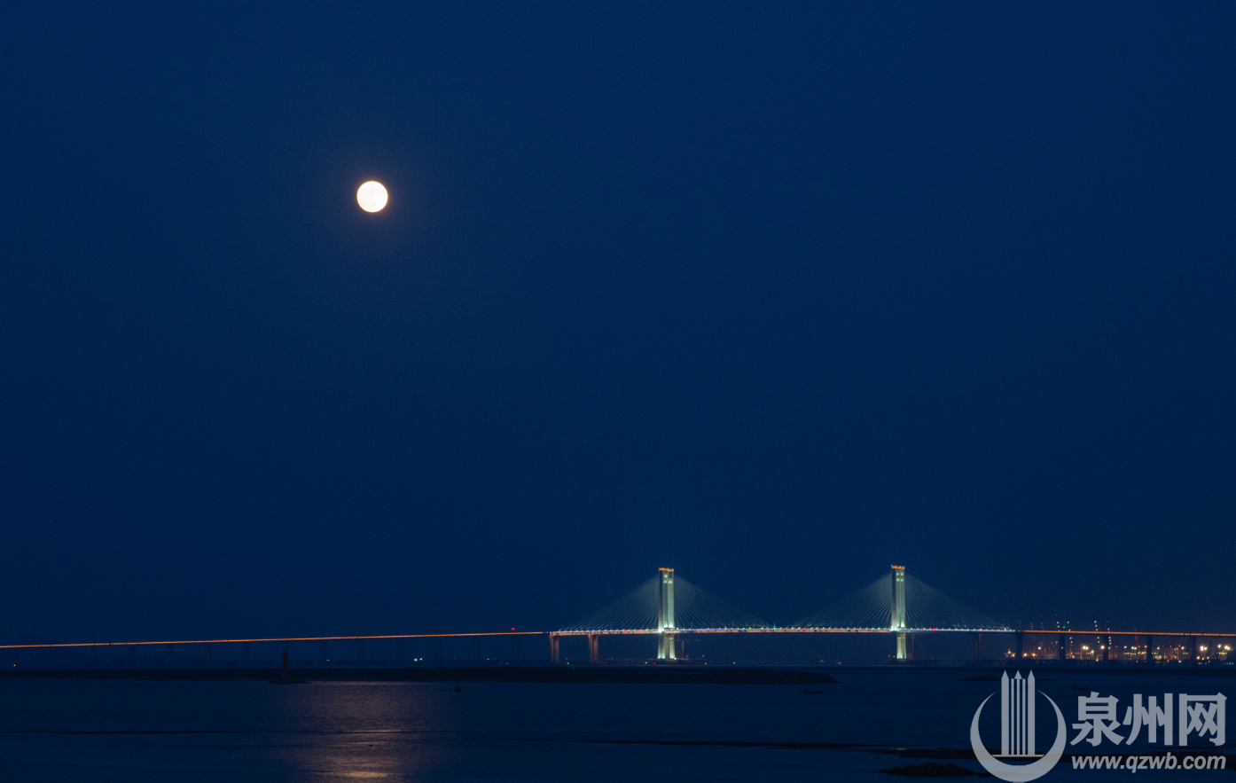 《泉州湾上升明月》今天是中秋佳节,我市天气晴好,18时多,从市区滨海公园向东远眺,泉州湾大桥上空,月亮缓缓升起,夜色平静而美好。(陈起拓 摄)