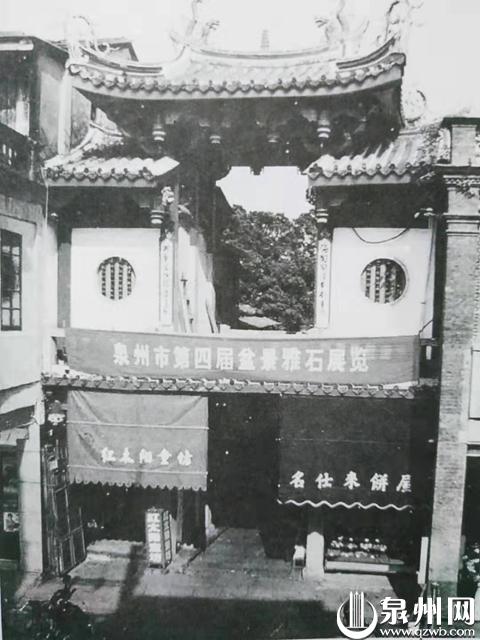 这是上世纪的泮宫,上面挂着第四届盆景雅石展览的横幅,下面是童装店和点心店,高雅文化和市井味道在这里融合。