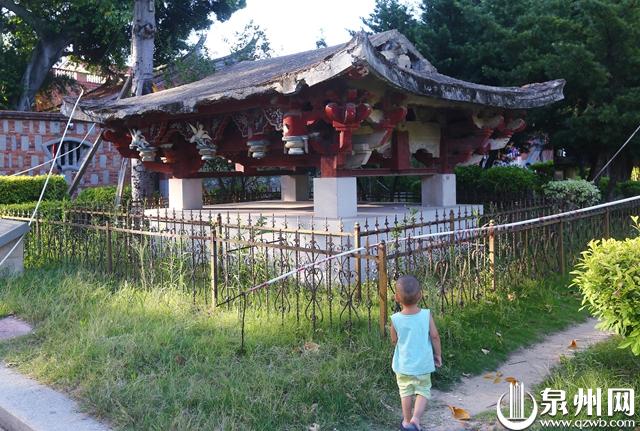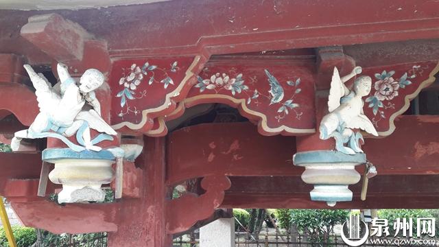 有趣的是,旧屋顶上还有两个“小天使”模样的雕塑(默默/摄)。据许月才分析,傅维早当年设计牌楼时,采用了钢筋混凝土的结构,一是坚固耐用,二是能体现时代美感。他特别喜欢泉州古建筑上的飞天形象,在泮宫对面金鱼巷的故居内,也设计飞天雕塑。当年在泮宫屋顶上加上飞翔的“小天使”,中西合璧,同样是时代美感的延续。