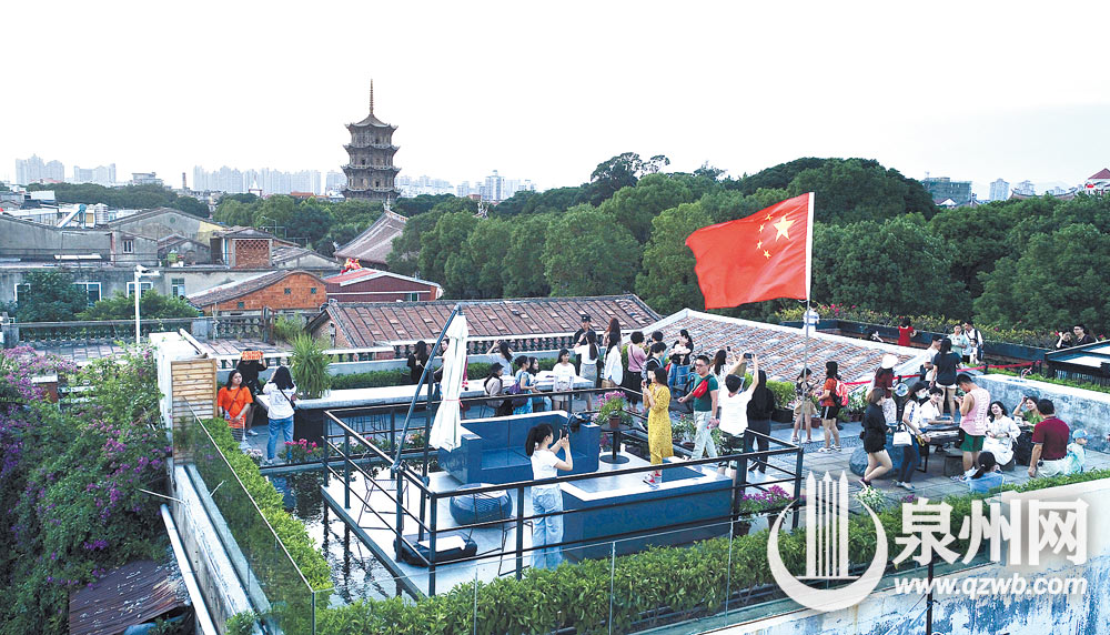 游客们在泉州市区西街一建筑天台上欣赏古城美景 。(张九强 摄)