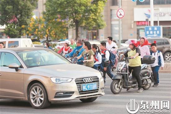 昨日下午4点多,记者驱车前往泉州师范学院第二附属小学,当时正值放学时间,不少家长前来接孩子。东海大街与东滨路路口距离学校西北门100多米,是学校大多数学生的必经之路。记者在路口观察,部分学生家长骑着电动车载着小孩,没有观察左右有没有车辆驶来,直接穿过斑马线驶向对面,加上东海大街通行的车辆多,车速较快,非常危险。也有部分自己回家的学生,未行走在斑马线,直接横穿马路,路面上车来车往,险象环生。