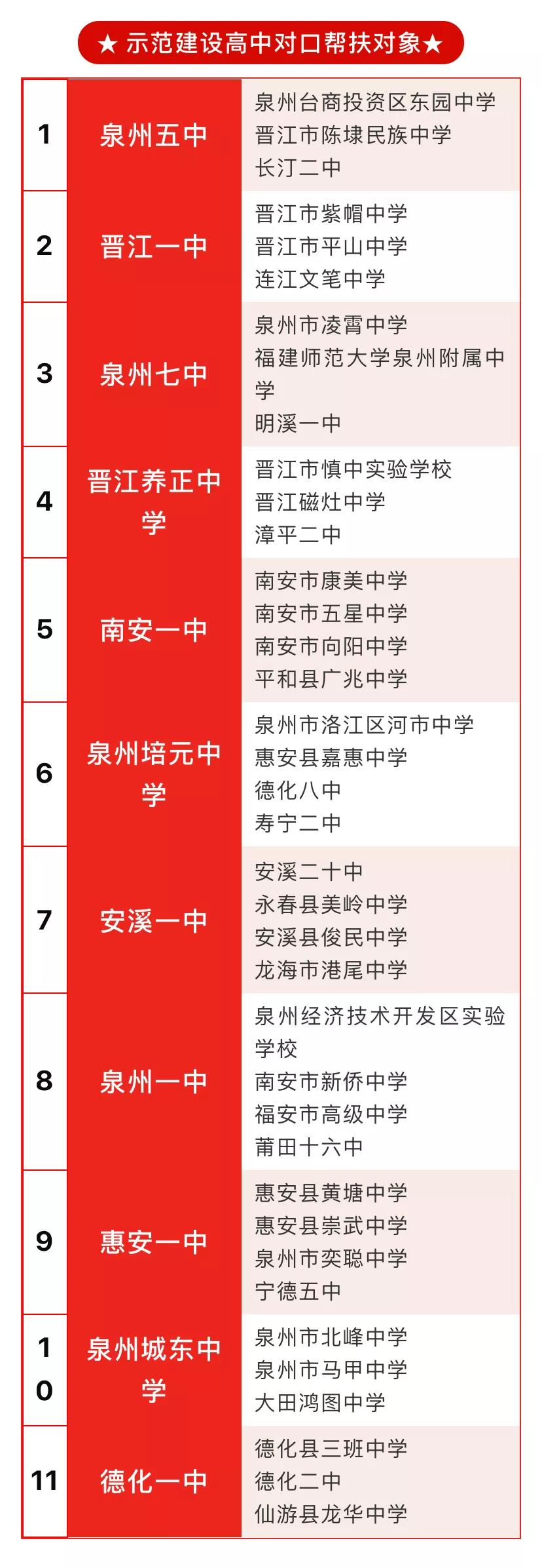 据悉,泉州市有11所示范高中建设学校,分别是泉州五中、晋江一中、泉州七中、晋江养正中学、南安一中、泉州培元中学、安溪一中、泉州一中、惠安一中、泉州城东中学、德化一中,每所学校各对口帮扶1-2所初中校(或初中部),以及2-3所高中校(或高中部)。