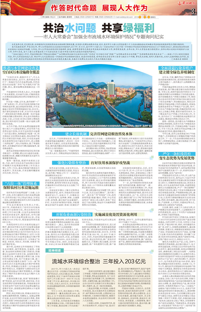 “《决议》通过三年多,市政府都采取了哪些治水措施?”“如何解决部分城乡生活污水处理厂仍存在‘吃不饱吃不好’问题?”“如何根治黑臭水体问题?”“怎样保障农村饮用水安全?”……短短1个多小时的专题询问会,市人大常委会组成人员、部分市人大代表聚焦进一步推进全市流域精细化整治、改善水环境质量,向市政府及其有关部门负责人抛出14个问题。事关民生话题,询问人有备而来,应询人直面问题认真作答,在一问一答中,探寻全市流域水环境实现水清岸绿的共治共享绿色发展之路。本报今日就群众关注的几个热点问题进行摘录。 □记者 颜雅婷