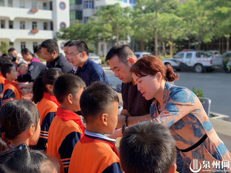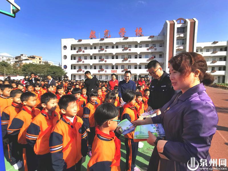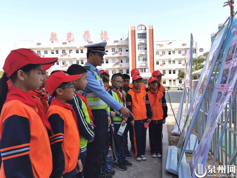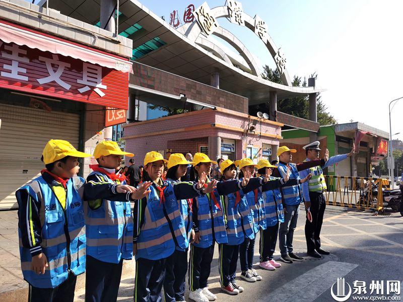 校内普法活动后,陈埭交警中队民警和学校校领导带领部分学生和家长、企业代表,到马路边,现场解说学生如何安全过马路、安全文明乘车,及如何识别不符合规定的车辆等知识。活动最后,交警让学生们戴上小红帽,身穿反光马甲,手持劝导旗,站在安全的区域内,体验交警执勤工作,当起一名小小的交通指挥员。