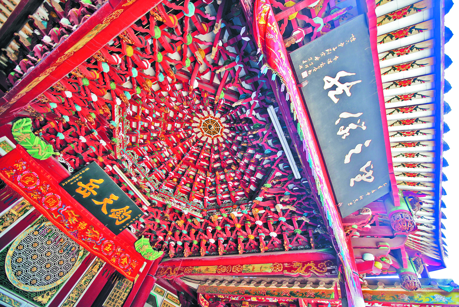 闽南寺庙中流行一种藻井,称“网目”藻井,又称“蜘蛛结网”藻井。据《闽南传统建筑营造技艺》介绍,网目藻井是在方形的平面上由向内层层出挑的斗栱组合而成。斗栱的华栱或斜栱相互交错,称网目斗栱。网目藻井与建筑浑然一体,没有与大木作分享的模型感。闽南的网目藻井以泉州市开元寺戒坛、泉州府文庙尊经阁、沙格灵慈宫拜亭、峰尾东岳庙戏台等最具代表性。泉州开元寺戒坛重建于清康熙五年(1666年),它的藻井是闽南网目藻井现存最早的作品。峰尾东岳庙戏台的藻井,其八角井皆分上下二层,下层用双补间,上层用单补间,使斗栱组合匀称。其方井、角蝉还用斜栱,由繁至简,略显变化。藻井的斗子皆用不同颜色彩画,以红色栱、枋为背景,仰望如繁星闪烁。
