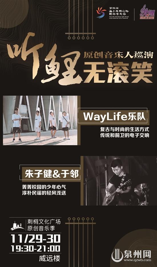 泉州网11月28日讯 (记者赖小玲)如果你已错过金鱼巷、肃清门、小西埕的“听鲤”原创音乐人巡演专场,请不要遗憾,本周的周五、周六晚,他们将在威远楼继续把爱唱给你听,让你度过一个浪漫的周末之夜。