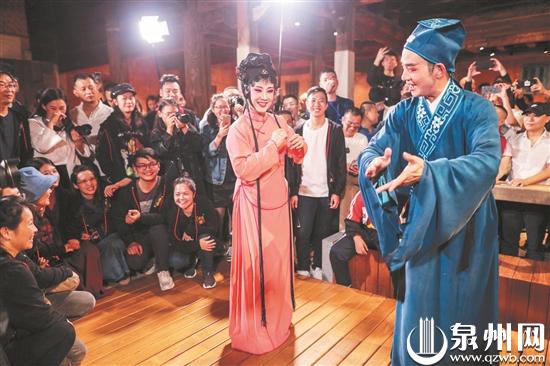 梨园传统折子戏《过桥入窑》在晋江五店市上演,观众近距离欣赏。
