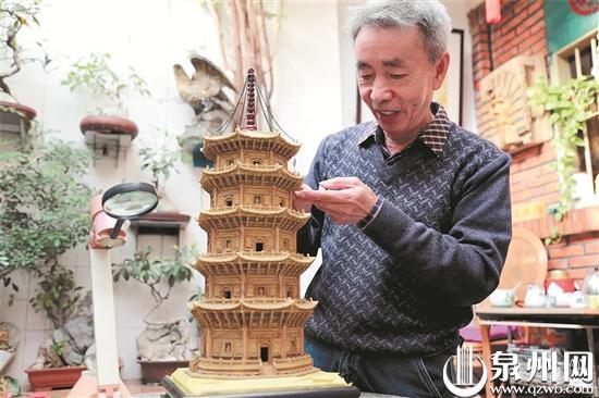不看东西塔,不算到泉州。象峰巷正对开元寺,距离巷口不远,一处闽南传统的古厝就是74岁的许天恩的家。“每天走出家门,抬头就能看到东西塔,它们陪伴我成长,给我留下的回忆太多了。”从小与双塔为邻,老人与两座石塔有着深厚的感情。退休后,他绕着古塔拍摄了上千张照片,并研究了不少书籍资料,最终利用油泥创作出精美的缩小版东西塔模型,表达自己对家乡的热爱。□记者 王丽虹 通讯员 陈嘉斌 文/图