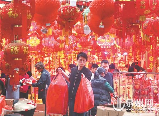 泉州网1月13日讯(记者王柏峰 摄影报道)春节临近,节日气氛越来越浓,对联、大红灯笼、中国结,还有各式各样的鼠年饰品等年货火爆热销。昨日,在泉州市区天后路热闹非凡,年味十足,不少市民在这里选购年货。