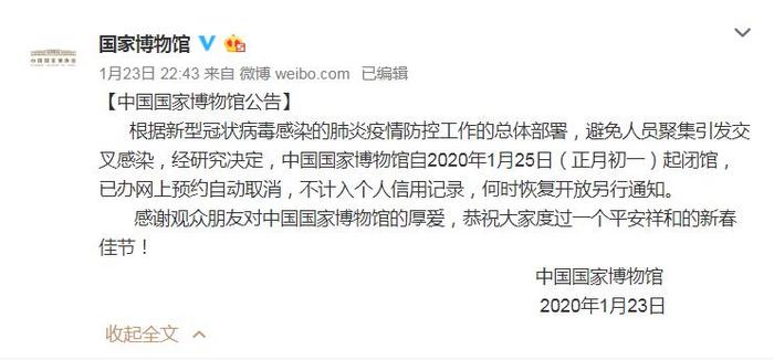 中新网北京1月23日电 (记者 应妮)记者从国家博物馆获悉,根据新型冠状病毒感染的肺炎疫情防控工作的总体部署,避免人员聚集引发交叉感染,国家博物馆自2020年1月25日(正月初一)起闭馆,已办网上预约自动取消,不计入个人信用记录,恢复开放时间另行通知。