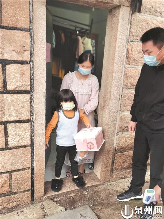 泉州网2月18日讯 (记者张晓明 文/图)2月16日上午,晋江陈埭镇高坑村出现温馨一幕:村委会工作人员为外地返回晋江居家隔离的冯女士家送去生日蛋糕,母女俩感动不已,连声道谢。
