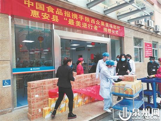 2月13日上午,中国食品报社携手陕西众果果汁有限公司向福建省惠安县医院捐赠价值10万元的纯果汁,并为即将出征武汉的“逆行者”送上了慰问金。无独有偶,2月9日、10日,该县工商联爱心商家、四季果园、天山小区业主委员会(志愿者)、大唐物业等社会各界爱心企业和志愿者团队为防控一线工作人员捐赠了2000斤蔬菜、10箱鸡蛋、400盒圣女果、1000个口罩、20箱纯牛奶、20箱花生牛奶等物资……