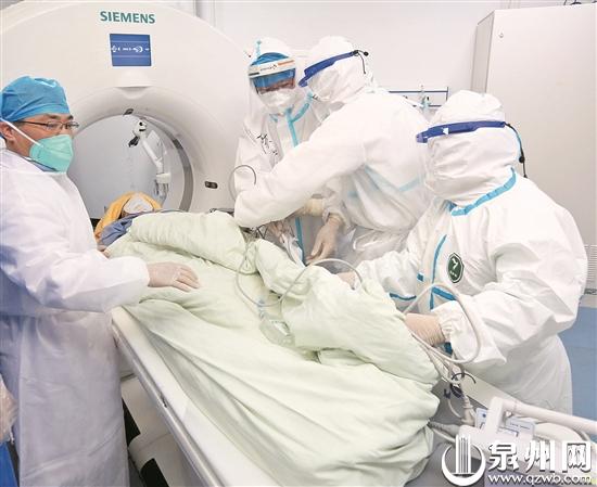 担架固定好后,救援人员将其抬上救护车。在警车开道下,救护车一路疾驰到泉州市第一医院。