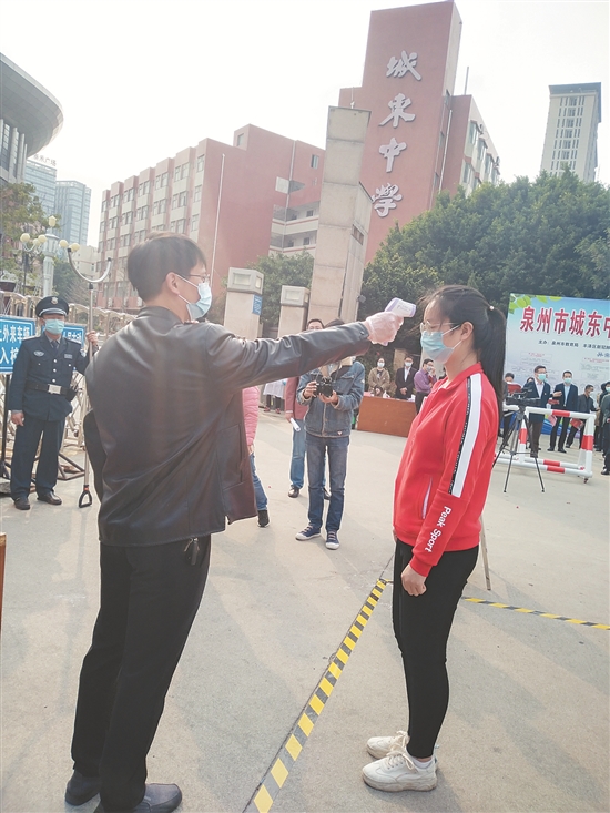 在泉州市城东中学举行的应急演练中,学生进入校门前测量体温。