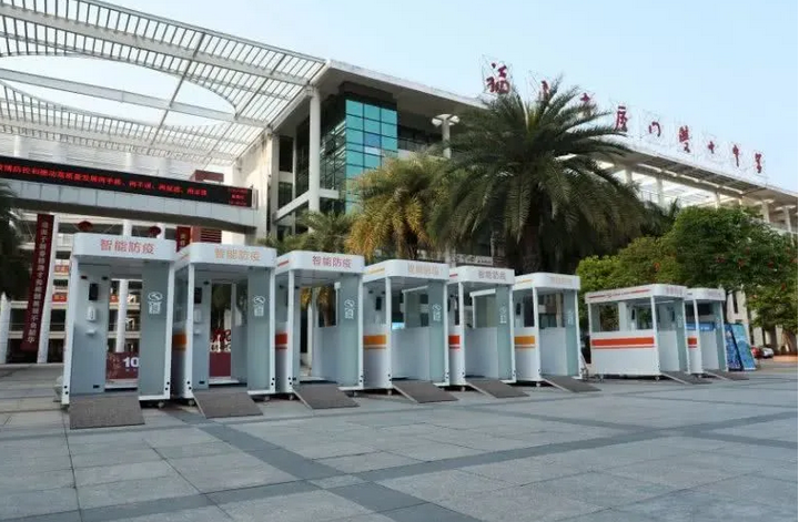 一些学校门口用上了红外线设备监测和体温枪监测,一些学校则直接安装智能防疫站,集监测和消毒为一体。3月20日,记者在厦门双十中学看到,8个金龙ANMO智能防疫站在门口一字排开,15秒内就可一站式搞定体温监测、口罩佩戴侦测、智能考勤和360度消毒。