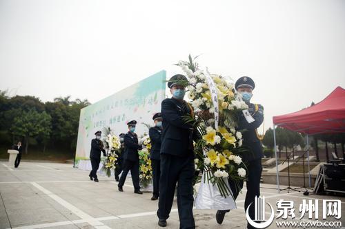 在公祭仪式上,礼仪人员为骨灰存放处逝者敬献花篮