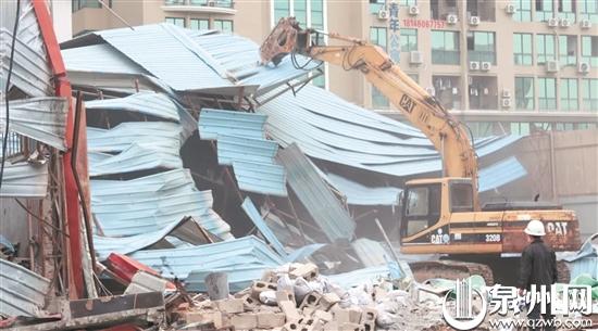近日,丰泽区城管局、东海街道办事处、法石社区等单位联合组织100多人,对位于市区东海街道法石社区云鹿路的万通石材厂一处存在安全隐患的钢结构建筑物进行拆除,拆除面积1500平方米。据了解,该钢结构建筑物出现地基下陷、墙体开裂、部分屋顶坍塌等现象,存在严重安全隐患。东海街道和法石社区工作人员在排查中发现后,及时告知房东和租户,讲清危房存在的安全隐患,并做好劝导工作,在3个小时内组织业主清空货物,安排拆除人员实施拆除。