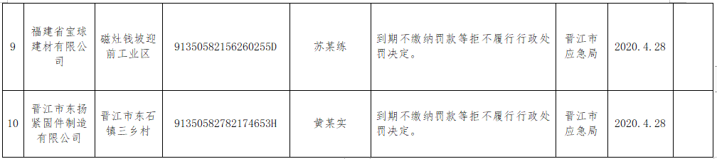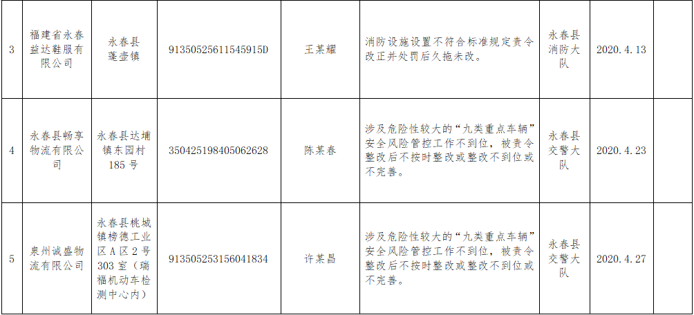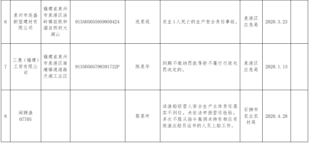 泉州市2020年第二批市级安全生产大排查大整治失信联合惩戒对象及人员名单