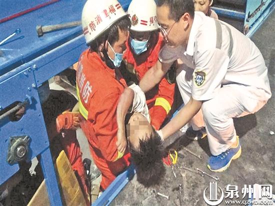6月20日20时56分,泉州台商投资区一名小孩的右手小臂被卷入快递输送机械的滚轴内,滚轴带动将男童身体向上吊。小孩命悬一线,情况十分紧急。事发后,赶来的消防队员找来小板凳垫在男孩脚下,两名消防员蹲在男童脚下,托起孩子悬空的身体,减轻身体的重力对右手的伤害。经过消防队员和机械师傅的共同努力,小孩右手成功抽离,并转送到医院治疗。