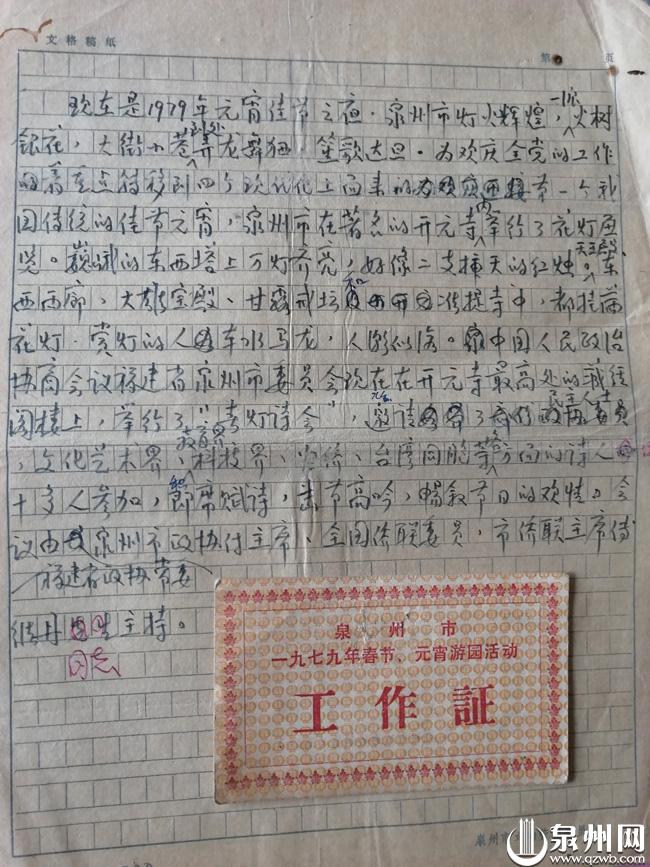 1979年开元寺元宵春灯诗会在藏经阁上举行,这是主持人陈泗东的工作证以及手写的主持稿,描述当年泉州元宵节“弄龙舞狮、笙歌达旦”的花灯会。(陈笃恒/供图)