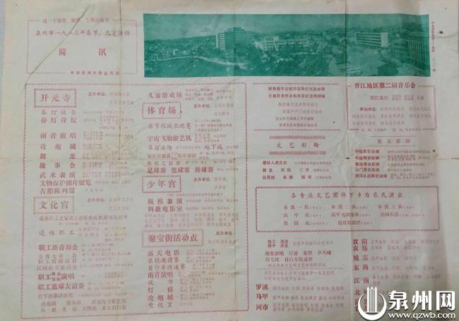 这是泉州市1983年春节、元宵活动的简讯,可以看到开元寺内有春灯谜会、春灯诗坛、南音演唱、攻炮城、舞龙、故事会、武术表演、文物保护展览,内容丰富多彩,人们在“拳头、烧酒、曲”中欢度佳节。(蔡其呈/供图)