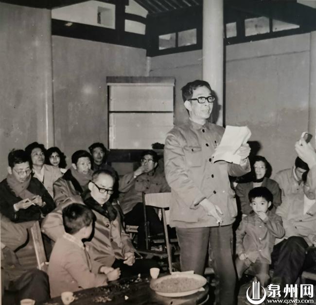 泉州市1984年元宵节,开元寺春灯诗画联欢会上群贤毕至,泉州文管会主任陈泗东即兴作诗并吟诵。(杨湘贤/供图)