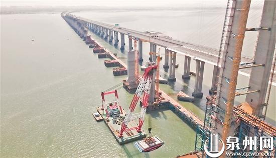 福厦高铁泉州湾跨海大桥首榀钢箱梁吊装现场