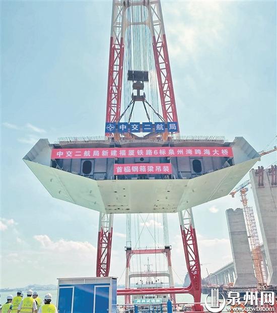 泉州湾跨海大桥是国内首座跨海高铁大桥,也是在建的福厦高铁的重点控制性工程,大桥全长20.287公里,其中海上桥梁长8.96公里,主桥长800米、主跨400米,为双塔双索面钢混结合梁半漂浮体系斜拉桥,主桥梁面由77节钢箱梁组成。此次吊装的钢箱梁长10.5米,宽21米,高4.25米,重313.9吨,为主桥第一号梁,也是整个福厦高铁吊装的第一榀钢箱梁。