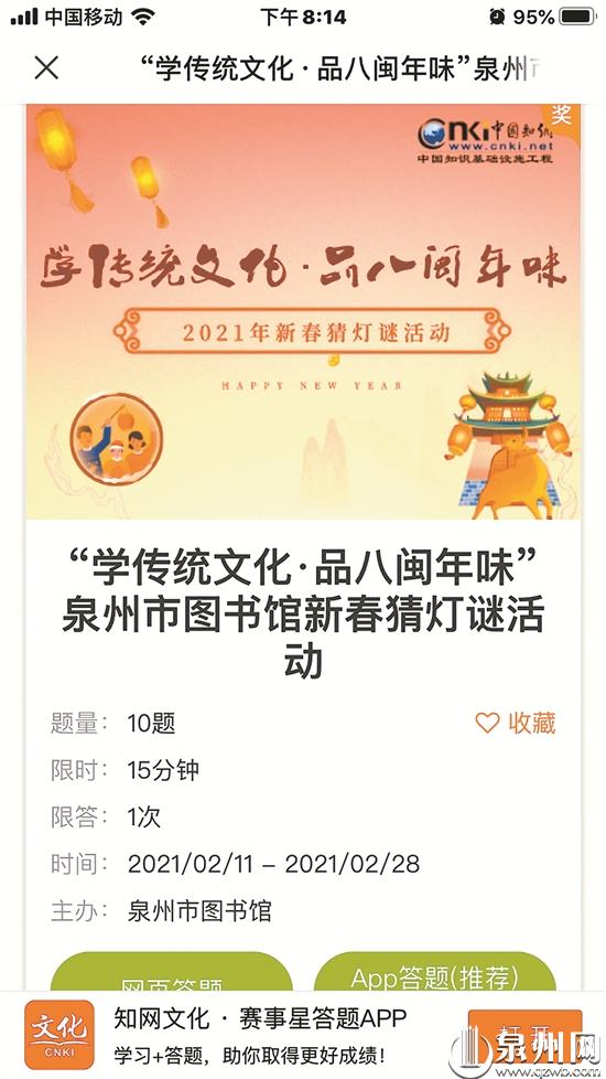 泉州市图书馆有系列的线上答题活动,内容有经典阅读、学传统文化、线上展览、楹联文化等。