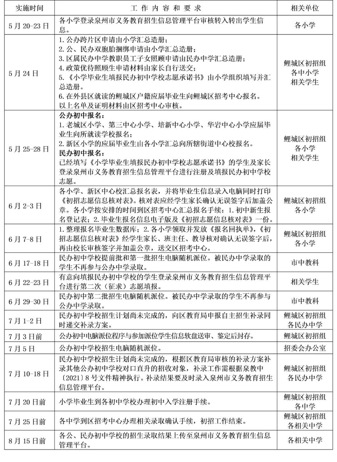 鲤城区公办初中学校招生电脑派位时间为7月5日,派位结果由原毕业小学公示并通知到每一位学生,各公办初中学校公布录取名单。民办学校泉州现代中学、泉州科技中学、泉州实验中学鲤城附属学校、泉州外国语学校(学府校区)等民办初中学校报名人数未超过招生计划数的,学校应一次性全部录取;当报名人数超过招生计划数的,全部实行电脑随机派位录取,民办校网上报名时间为5月25日至28日。