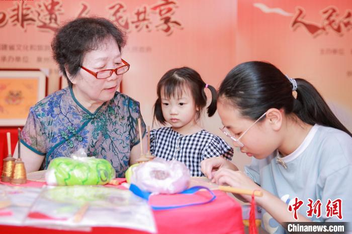 活动现场,包括泉州源和堂蜜饯、永春熟地、永春酿酒、英都麻糍、崇武鱼卷、安海土笋冻、泉州南音乐器、泉州螺钿、泉州珠绣、永春漆篮、永春香等制作技艺在内的40个非遗体验项目,吸引众多市民带着孩子观摩、体验。