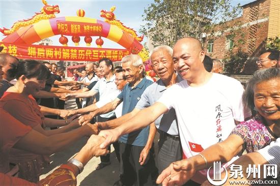 泉州网6月17日讯(记者 陈灵 黄耿煌 通讯员 李晓梅 黄成贵 文/图)15日这一天,对于南安美林街道金枝村与玉叶村圳后自然村、石井镇院前村与杨山村东安下自然村来说是特殊的日子。不确定从何时起,因何原因,上述村庄虽然相邻,却互不通婚。随着经济社会的发展,移风易俗新风尚深入人心,村民的观念也逐渐发生改变,互不通婚的陈规显得不合时宜。经过前期各村村两委、老人协会的沟通协调,美林、石井两地不约而同地选在15日这天举行仪式,破除百年陈规,不少村民都赶来见证这一历史性时刻。