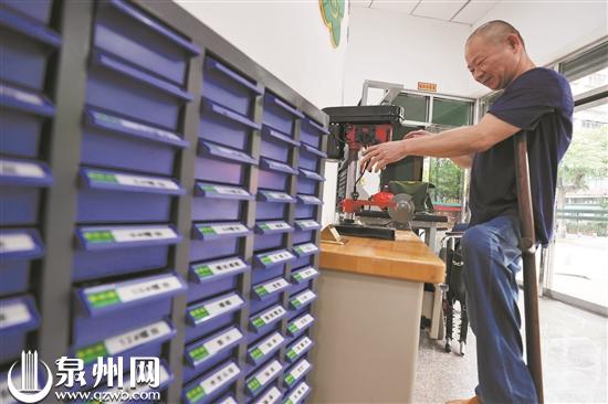 泉州网8月3日讯 (记者李菁 潘登 文/图)在泉州残疾人康复中心一楼设置的辅具服务站里,胡师傅正拄着拐杖为一位从安溪来的残疾人修理轮椅。今年5月,该辅具服务站正式运营后,修理30多年自行车的胡师傅便上岗了。作为一名残疾人,他不仅在这里找到了一份稳定的工作,还能为其他残疾人提供更多帮助。