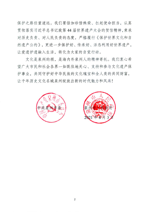 文化是泉州的根,是海内外泉州人的精神寄托。我们衷心希望广大市民和社会各界一如既往地关心、支持和参与文化遗产保护事业,共同守护好中华民族的文化瑰宝和全人类的共同财富,让千年历史文化名城泉州绽放出新的时代魅力和风采!