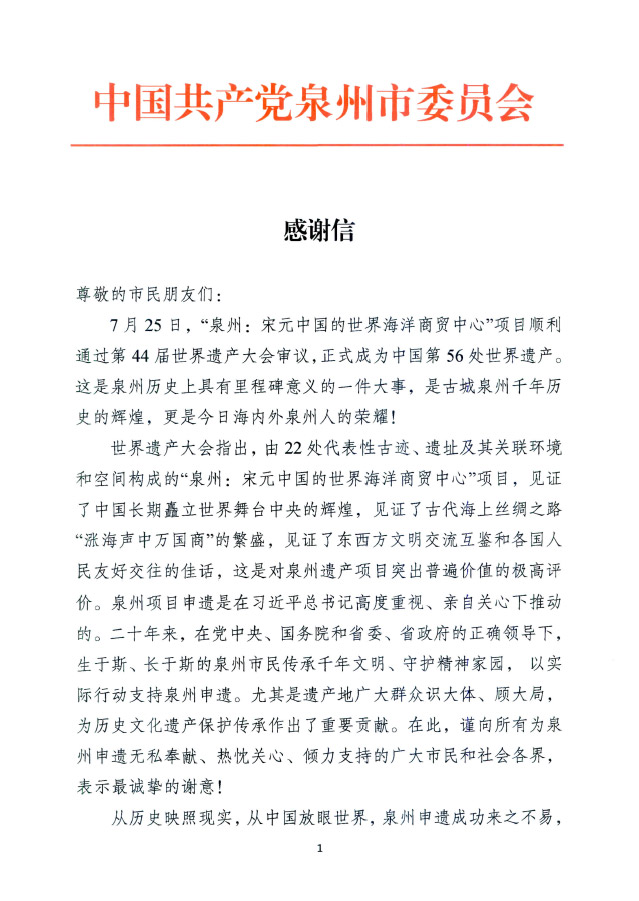 世界遗产大会指出,由22处代表性古迹、遗址及其关联环境和空间构成的“泉州:宋元中国的世界海洋商贸中心”项目,见证了中国长期矗立世界舞台中央的辉煌,见证了古代海上丝绸之路“涨海声中万国商”的繁盛,见证了东西方文明交流互鉴和各国人民友好交往的佳话,这是对泉州遗产项目突出普遍价值的极高评价。泉州项目申遗是在习近平总书记高度重视、亲自关心下推动的。二十年来,在党中央、国务院和省委、省政府的正确领导下,生于斯、长于斯的泉州市民传承千年文明、守护精神家园, 以实际行动支持泉州申遗。尤其是遗产地广大群众识大体、顾大局,为历史文化遗产保护传承作出了重要贡献。在此,谨向所有为泉州申遗无私奉献、热忱关心、倾力支持的广大市民和社会各界,表示最诚挚的谢意!
