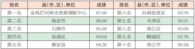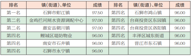 泉州网8月30日讯 (记者吴志明 通讯员邱一漫)7月份,泉州市城市管理综合考评中心对全市海岸带(近岸海域和海岸线向陆一侧200米的陆域)和晋江入海口至金鸡拦河闸上游100米的晋江河道环境卫生情况进行考评。其中,在各县(市、区)、市级单位中,金鸡拦河闸水资源调配中心再次夺魁,晋江市再次倒数第一。从各镇(街道)、单位成绩来看,石狮市蚶江镇获得第一名,鲤城区堤防物业、南安市石井镇、石狮市永宁镇、石狮市鸿山镇、台商投资区东园镇、台商投资区洛阳镇、丰泽区城东街道、晋江市东石镇等并列第四名。(具体成绩详见下图)
