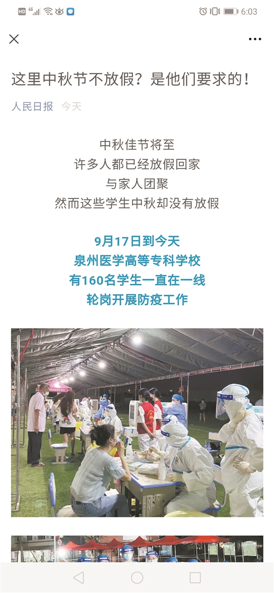 泉州网9月20日讯 (记者张素萍 通讯员姜学瑞 文/图)中秋节前夕,许多人放假回家与亲人团聚,泉州医学高等专科学校的160名“00后”学生却主动要求不放假,只为奋战在抗疫一线。昨日,人民日报、中国青年报等媒体的微信公众号点名表扬了他们挺身而出的精神,全国各地的网友也纷纷为他们点赞。