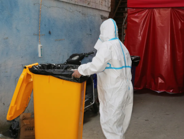 工作人员穿好防护服,进入管控区域打扫