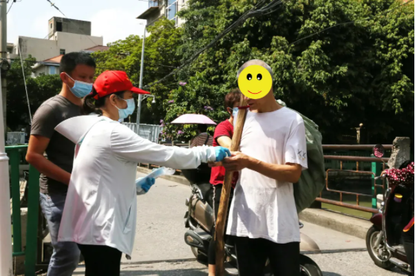 工作人员为未佩戴口罩的居民分发口罩