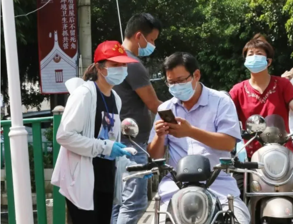 工作人员对来往居民进行测温、验码