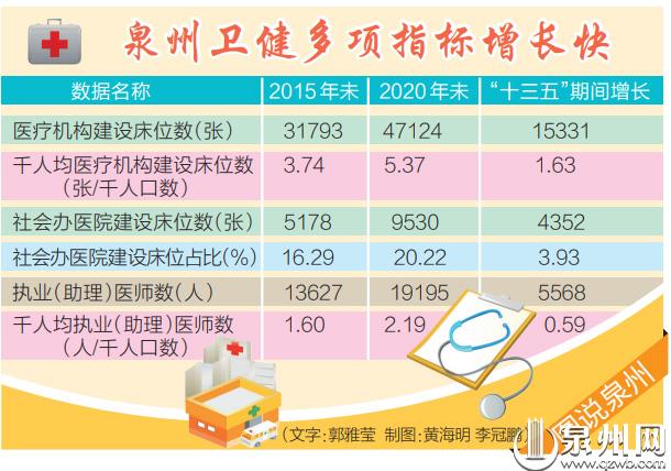 五年来,泉州坚持补短板、强弱项,医疗资源供给得到大幅扩充。59个医疗卫生重点项目顺利推进,一批社会办医项目投入运营。目前,全市医疗机构床位数达4.71万张,比2015年新增1.53万张,千人均床位数由2015年的3.74张提高到2020年末的5.4张。卫生技术人员总数达50059人,比2015年增加12032人。