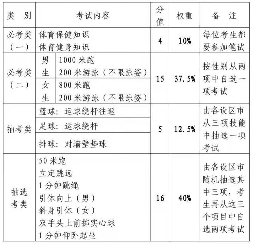 据悉,此次抽考类从三大球类:足球、篮球、排球中随机抽选一项。抽选考类从素质类六项:50米跑、立定跳远、1分钟跳绳、引体向上(男)/斜身引体(女)、实心球、仰卧起坐中随机抽选三项。
