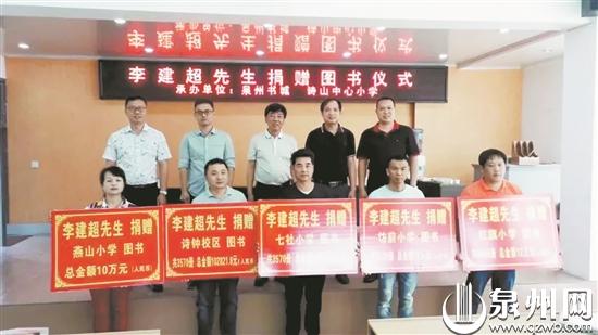 捐书,最初从李建超家乡诗山开始,很快,又扩展到金淘、码头、眉山、蓬华、向阳、九都、翔云等南安各个山头乡镇。随后,由南安扩展到永春、安溪、德化、洛江。从山区农村到城市,从幼儿园到高中、大学,从学校到社区图书室,有100多所学校、书屋受捐,所到之处,书香四溢。