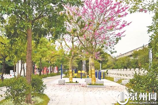午后阳光和煦,位于洛江区安和路旁的树阵“口袋公园”里,美丽异木棉笔直挺立,粉红花朵随风缓缓飘落,宛若一幅色彩斑斓、绮丽美好的画卷。
