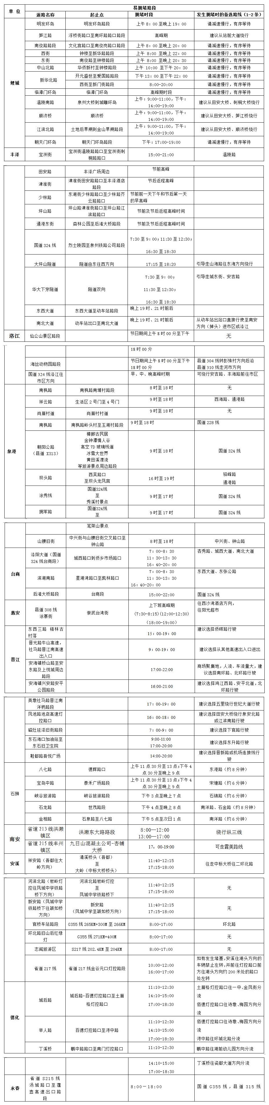 春运前后学校开始陆续放假,学生流、返乡流、探亲流、香客流相互叠加,客流高峰将呈现时间长、峰值高的特点。届时,市区的客运中心站、泉州动车站等车站周边路段,如泉秀街、坪山路、宝洲街、东西大道、站前大道等路段将有可能出现车多缓行、滞留现象;进出城的国道324线仕公岭路段、霞美路口、安吉路大坪山隧道路段、国道324线华侨大学下穿隧道、田安大桥、顺济新桥以及高速公路各出入口周边等路段的车流剧增;临漳门环岛路口、浦口环岛路段、田安泉秀路口等地会出现车辆滞留的现象;鲤城南环路路段、洛江区万虹路海丝动物园到仙公山路段、台商国道324线洛阳桥至侨乡市场路段、泉港山腰旧街路段、惠安县道308线涂寨街、石狮市石龙路世茂摩天城路段、德化城后路-百德灯控路口至土厝格灯控路口等辖区道路,也将迎来节前的交通出行高峰期。