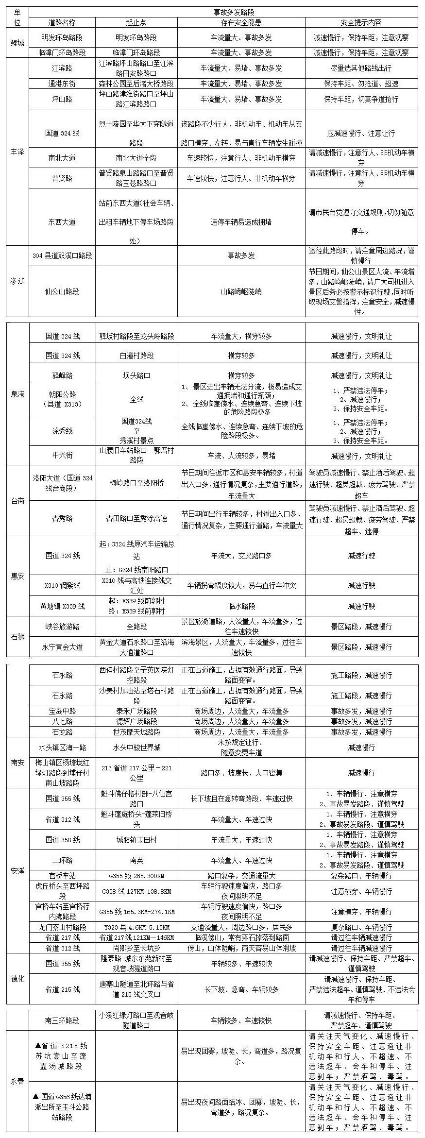 2022年春运期间(含春节)道路危险路段、事故多发点段