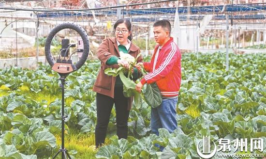 南安市向阳乡党委书记黄秋燕(左一)在田间协助菜农直播带货。(张九强 摄)