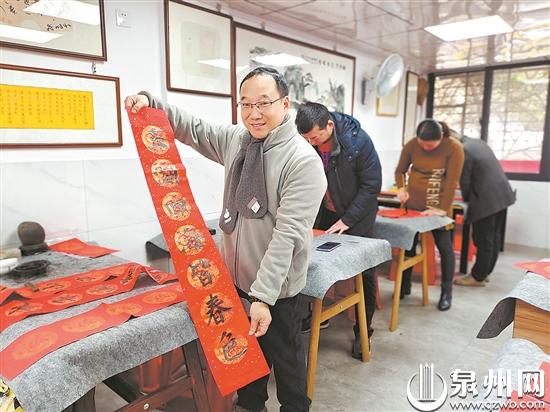 1月19日上午,张元清与参与活动的群成员相约至其工作室,共同书写春联。在现场,众人笔走龙蛇,一副副苍劲有力的春联,一个个喜庆吉祥的“福”字跃然纸上。