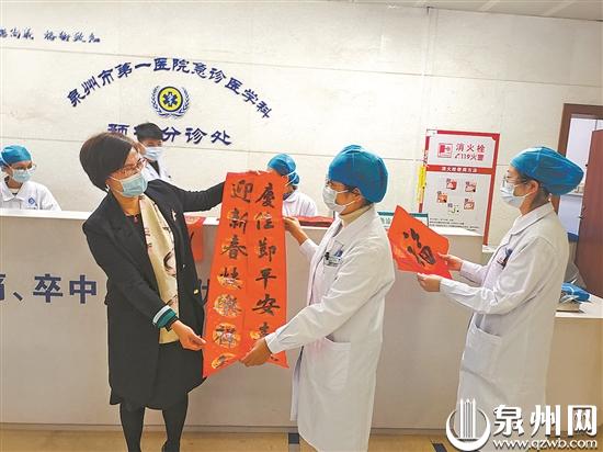 泉州网1月24日讯 (记者苏凯芳 通讯员万馨璟 文/图)临近春节,为向奋战在疫情防控及临床工作一线的医务工作者表达敬意,2022年“党报送祝福 春联抒真情”活动与泉州市第一医院携手,委托多位书法家和书法爱好者手写百副春联和福字。1月21日,记者与该院工会负责人将这些写好的春联送到该院医务人员手中。